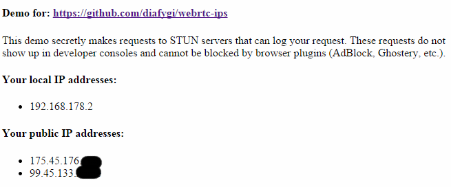 با چند خط از کد وب سایت ها می توانند برای سرورهای STUN درخواست بدهند و آدرس IP کاربران VPN و آدرس IP اصلی پنهان کردن ، همچنین آدرس شبکه محلی گزارش دهد.